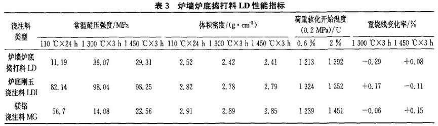 爐墻出現(xiàn)變形,中間縮窄,底部變寬,容易出現(xiàn)開裂:爐底出現(xiàn)大量的氧化鐵渣堆積,影響生產(chǎn)。其所用澆注料、搗打料的性能如下表: