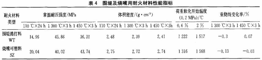 圍堤粘渣嚴重,阻礙了立柱的行程,圍堤也出現(xiàn)開裂,清渣時容易出現(xiàn)破損。其所用搗打料的性能如下表。變形量0.6%時圍堤搗打料的荷重軟化溫度為1222℃變形量2%時僅為1517℃,變形溫度的范圍比較寬,開始變形的溫度低,從1222℃變形量達到0.6%,搗打料容易發(fā)軟,粘渣就比較嚴重。燒嘴周圍搗打料形態(tài)穩(wěn)定,粘渣少,表明所用爐襯材料性較好,爐墻有內(nèi)陷、開裂情況,與搗打料的性能有關(guān)。圍堤及燒嘴所用可塑料的性能如表4.從表4看出,變形量0.6%時,燒嘴可塑料的荷重軟化溫度為1316℃,而變形量達到2%時僅為1568℃,這個溫度區(qū)間比較大,荷重軟化溫度提高,對于減少粘渣有利。