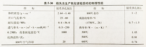 燒失法生產(chǎn)氧化鎂輕質(zhì)磚是以工業(yè)氧化鎂為原料,在1700℃下煅燒的熟料經(jīng)粉碎機(jī)除鐵處理后制成粉料。添加石油焦作為可燃加入物。物料中加入1%的亞硫酸紙漿廢液、水分為3%-4%,在30MPa的壓力下成型,干燥后在1700~1720℃燒成,保溫2h,其制品的性能見(jiàn)下表: