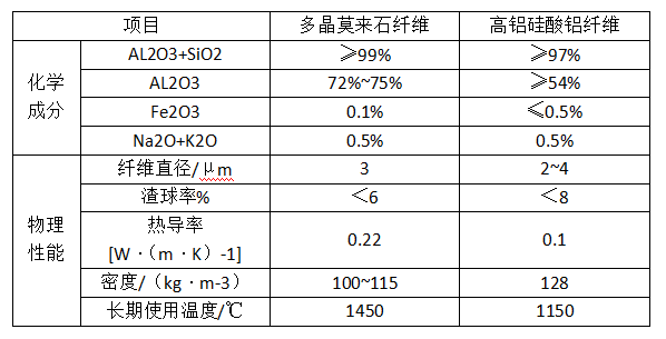多晶莫來石纖維與高鋁硅酸鋁纖維的主要性能比較見表1。