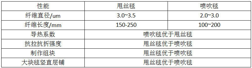 表1 陶瓷纖維毯甩絲毯和噴吹毯性能與應(yīng)用對(duì)比