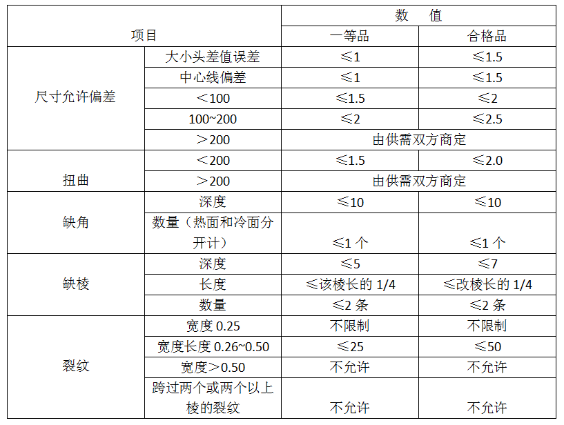 表2 水泥窯用磷酸鹽結(jié)合高鋁質(zhì)磚的尺寸偏差及外觀