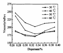 同時(shí)可以看出,在堿性條件下(料漿PH=9),30、40℃時(shí)分散劑對(duì)料漿粘度的影響較大,而50,60℃時(shí)分散劑對(duì)料漿粘度的影響較小,曲線較為平緩,表明高溫下由于聚合作用的發(fā)生,分散劑的作用明顯減小。