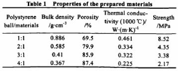 采用高鋁礬土和冶金硅灰作原料,聚苯乙烯球作造孔劑,利用凝膠注模工藝制備出高強(qiáng)輕質(zhì)莫來石-剛玉制品,主要探究料漿的最佳PH值和分散劑用量,測定了1550℃燒結(jié)樣品的強(qiáng)度、氣孔率、熱導(dǎo)率、物相組成和微觀結(jié)構(gòu),制備出的莫來石-剛玉材料體密0.37g/cm3,氣孔率87.37%,強(qiáng)度高達(dá)2.17MPa,熱導(dǎo)率僅為0.22W(m·k)。