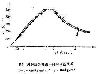 將圖1縫隙用散裝珍珠巖密封,厚度為5cm。將電爐功率控制在定值上(5kw),每隔一定時間記錄爐溫變化,并用測溫計測出兩個封口的保溫磚上表面的溫度值,然后作出升、降溫一時間函數(shù)關(guān)系圖,以及保溫磚表面溫度一時間圖,比較兩種保溫磚保溫性能。