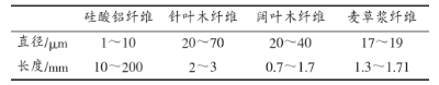 硅酸鋁纖維主要成分是Al2O3,是由含鋁元素的礦石高溫熔融后,經(jīng)過噴吹或甩絲后形成的纖維狀物質(zhì)。硅酸鋁纖維制品的體積密度比較小,一般為100~250kg/m3,而單位體積中空氣占94%~96%。雖然其形態(tài)與植物纖維相似,但是由于其構(gòu)成不同,它的物理化學(xué)性能與植物纖維有較大的差異。表1是硅酸鋁纖維與植物纖維在物理形態(tài)方面相比。