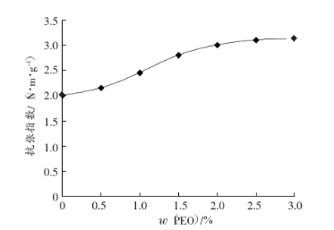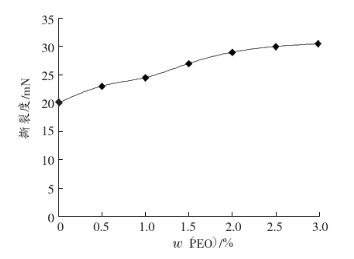 硅酸鋁纖維在不加入膠黏劑的情況下不能成紙,因此加入w(cmc)=10%作為膠黏劑,然后改變PEO的加入量,檢測PEO的加入量對成紙強(qiáng)度的影響。結(jié)果見圖6和圖7。