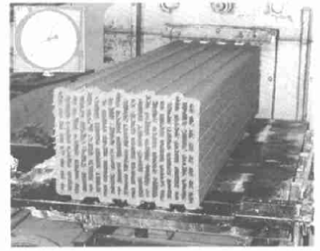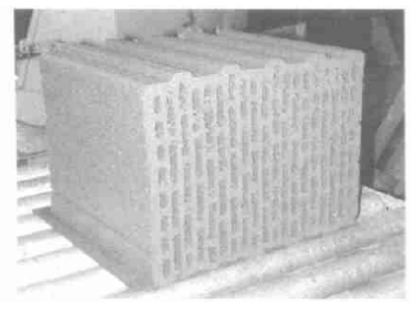 圖5為經(jīng)另一機(jī)口擠出的16排孔的短壁多孔磚,其磚坯的真實(shí)密度為0.82 kg/ dm3,孔洞率為50%時(shí)的體積密度為0.41 kg/ dm3,其導(dǎo)熱系數(shù)為人=0.094W/(m.K),