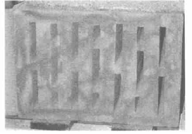抗壓強(qiáng)度為4. 4N/mm2。該多孔磚的缺點(diǎn)是;其在工業(yè)化的生產(chǎn)中不可避免地會出現(xiàn)扭曲變形,因此,擠出型的微孔多孔磚必須具有足夠厚度的外壁和齒狀的凸起,便于磚相互間組裝拼接(見圖6),從而消除砂漿連接引起的熱力學(xué)問題。在隨后的試驗(yàn)中還擠出成型了19排孔和13排孔的10DF微孔多孔磚見圖6圖7 ,這些磚外壁還有齒狀的凸起。