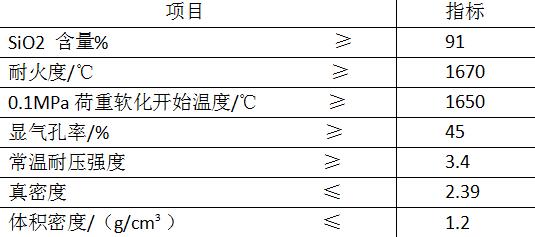 輕質(zhì)硅磚的礦物組成為:磷石英78%〜86%,方石英78%〜86%,石英78%〜86%。一般輕質(zhì)硅磚的耐壓強(qiáng)度2.0〜9.5MPa,熱導(dǎo)率0.35〜0.42W/(m·K)。輕質(zhì)硅磚具有優(yōu)良的耐火性能,荷重軟化溫度接近致密硅磚達(dá)到1620℃以上,僅有少量的殘余膨脹,并且其熱穩(wěn)定性能比致密硅磚好。因此,輕質(zhì)硅磚可在不與熔渣接觸的高溫條件下1500〜1550℃長(zhǎng)期使用。下圖列出了我國(guó)工業(yè)窯爐用輕質(zhì)硅磚的技術(shù)條件。